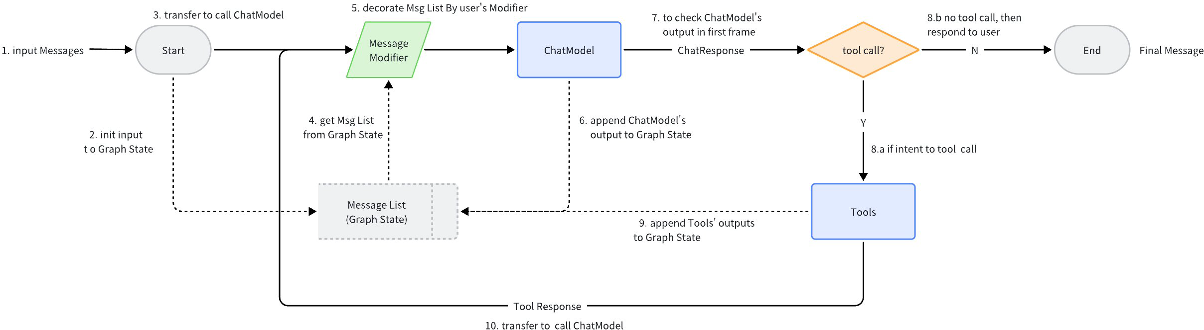 - It provides common components such as ChatModel, ToolNode, and PromptTemplate, and the business can be customized and extended.