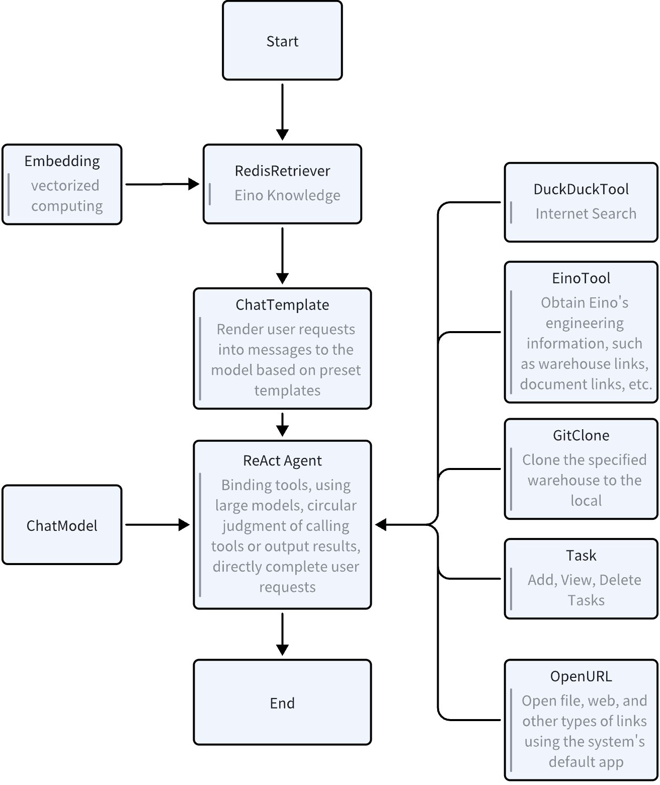 Construct a ReAct Agent based on Eino that retrieves knowledge from Redis VectorStore to answer user questions and assist users in executing certain operations, i.e., a typical RAG ReAct Agent. It can automatically help users record tasks, clone repositories, open links, etc., based on the dialogue context.