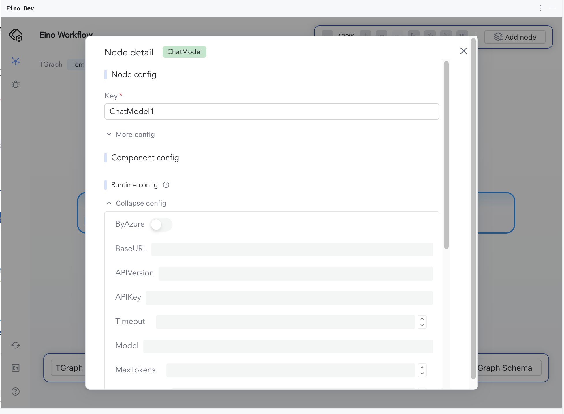 • 添加到 Graph 中 Node 插件会默认填写 NodeKey ,此外可展开 More config 为 Node 配置可选配置。