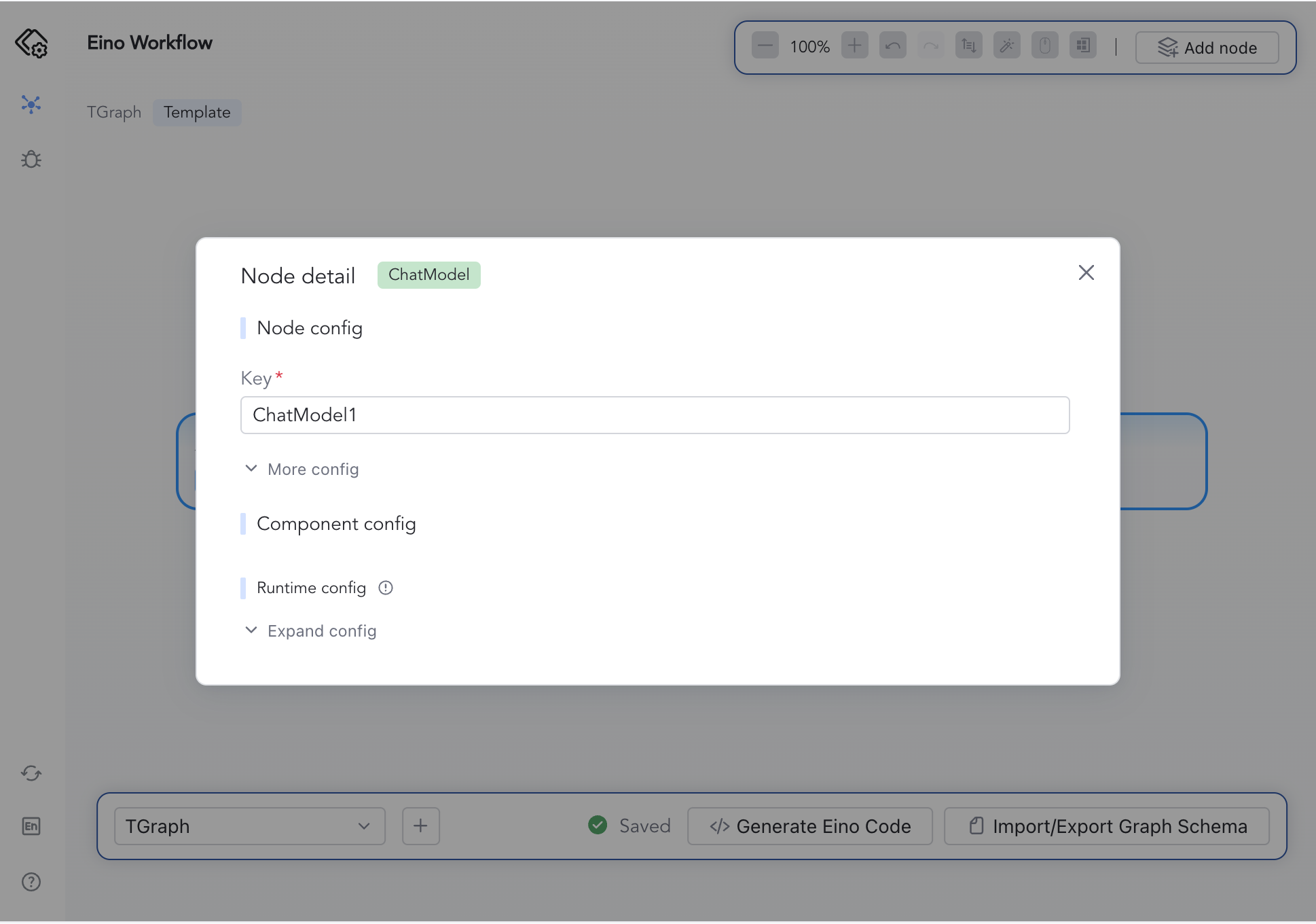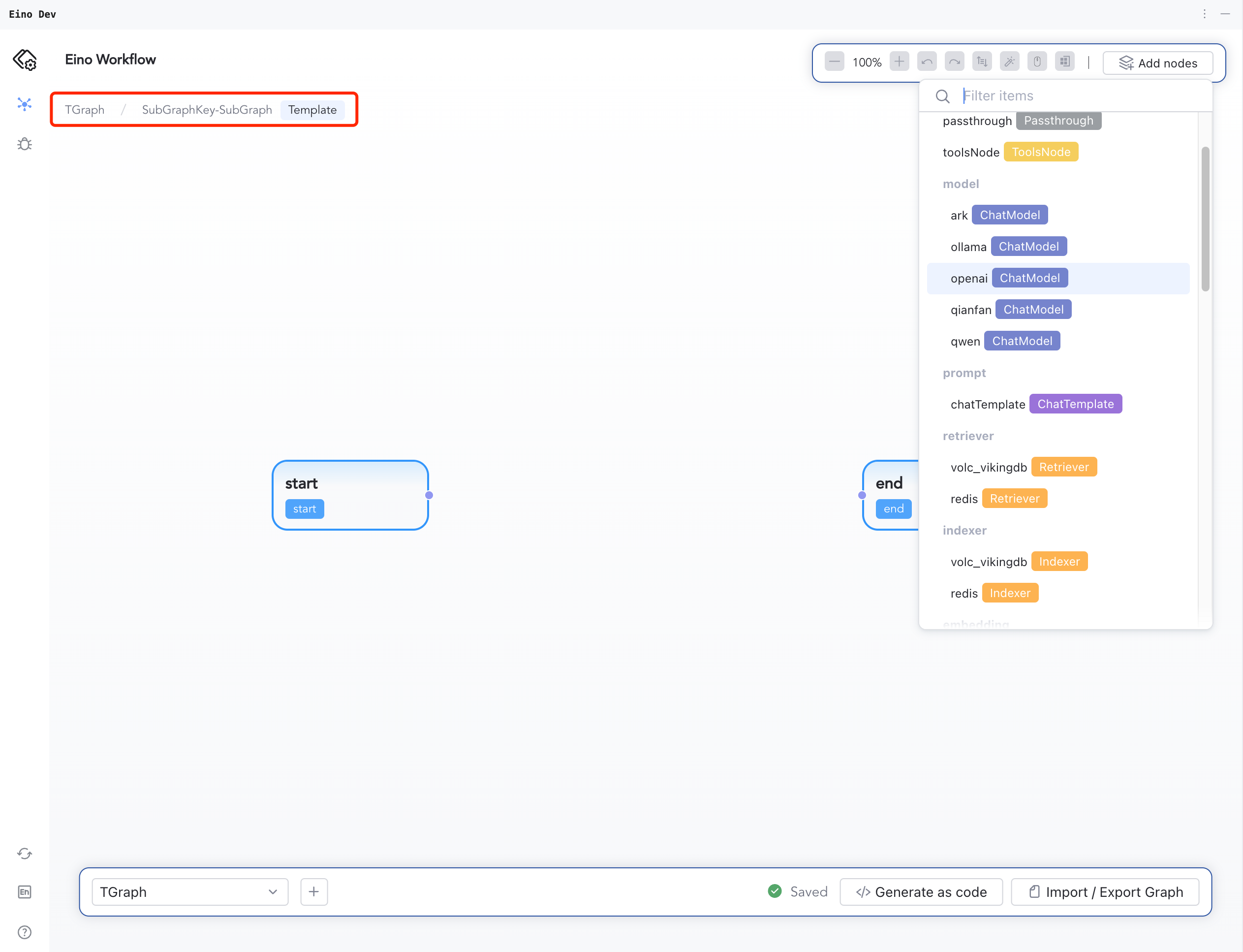 • 与 Eino 中的 Node 一致,创建 Graph 完成后,通过界面右上角 AddNodes ,添加不同类型 Node 到画布。