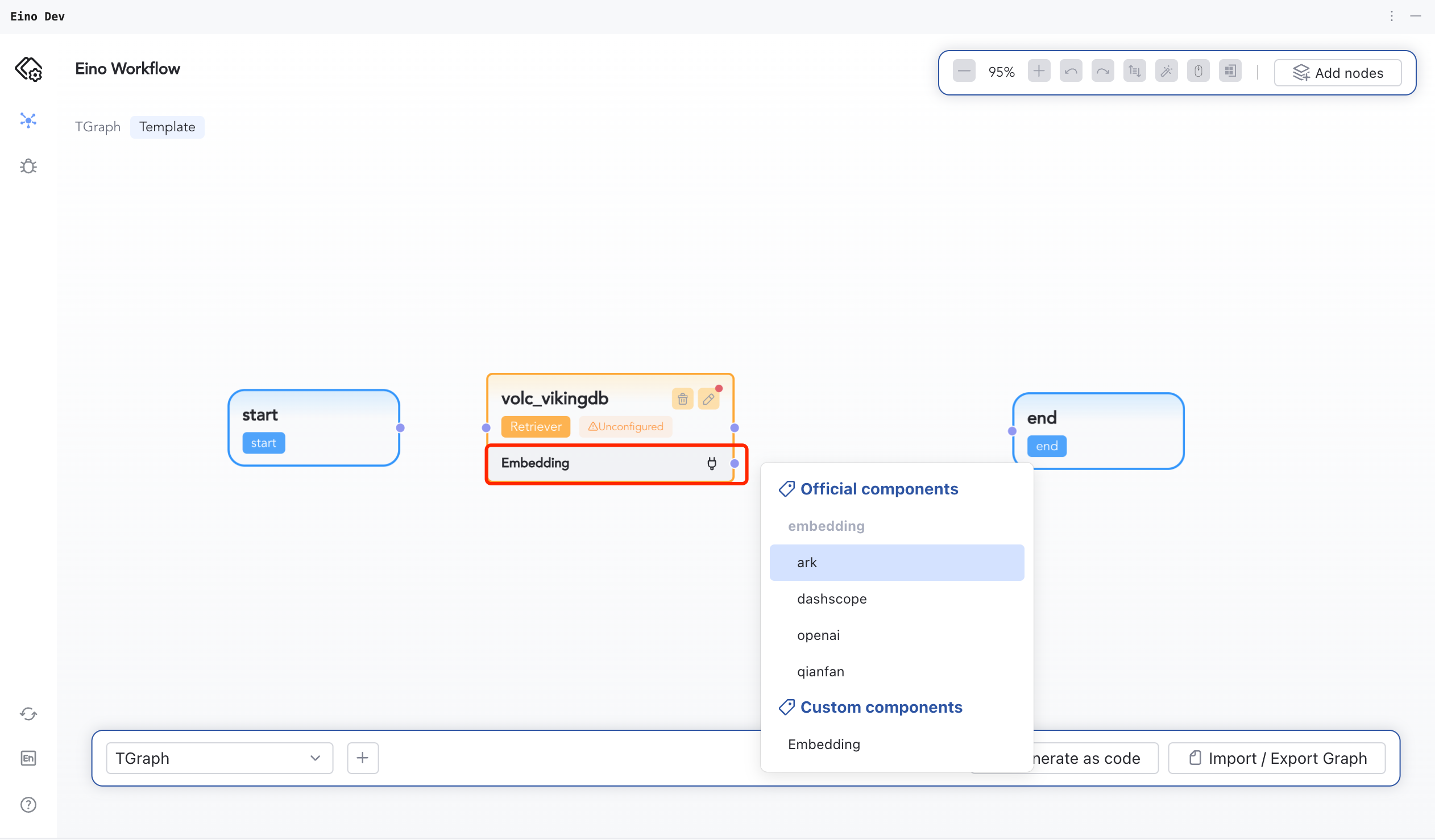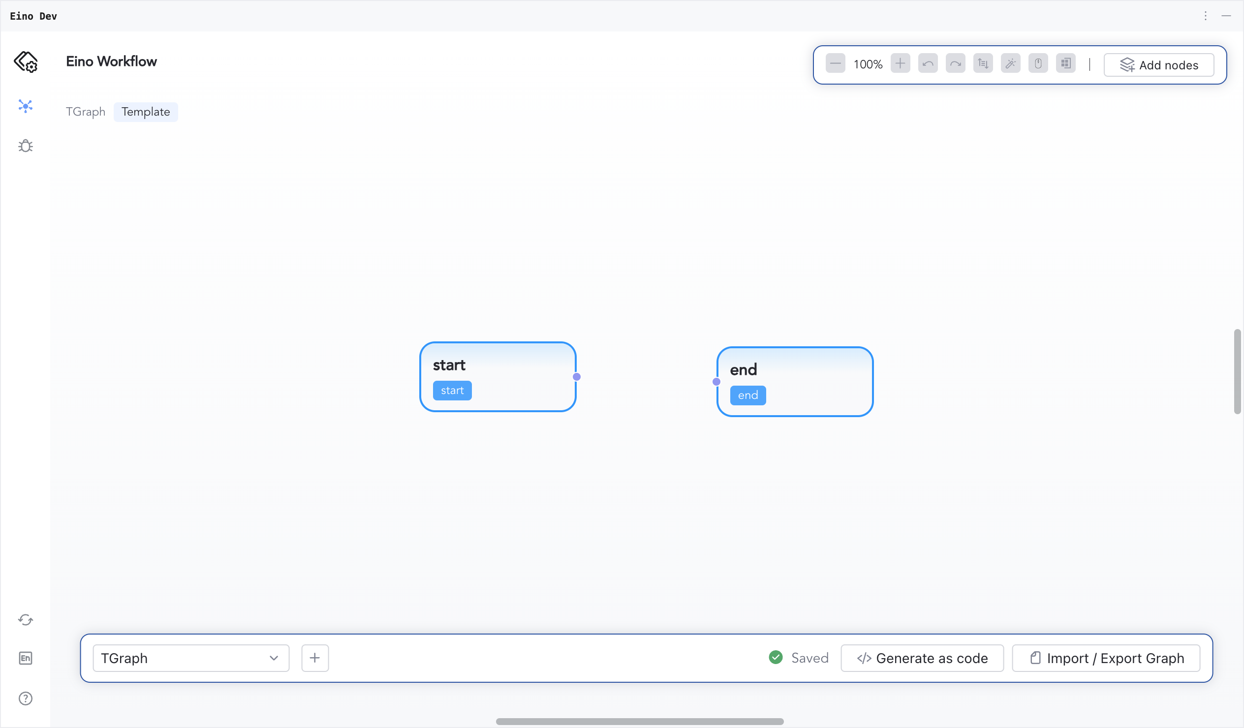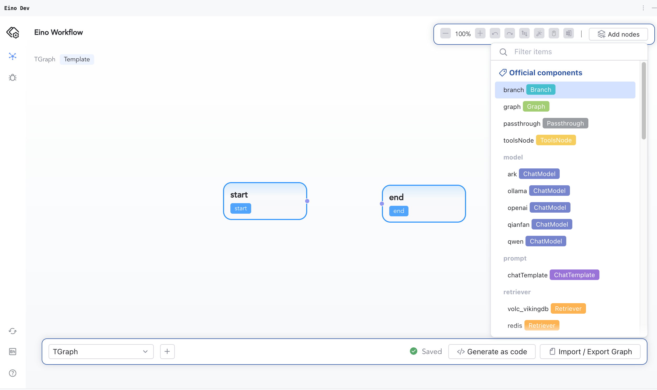💡 Goland 提供的 Eino 可视化编排插件, 在 GoLand 中可以通过组件拖拽实现 Graph 的编排生成代码,并支持导入导出
