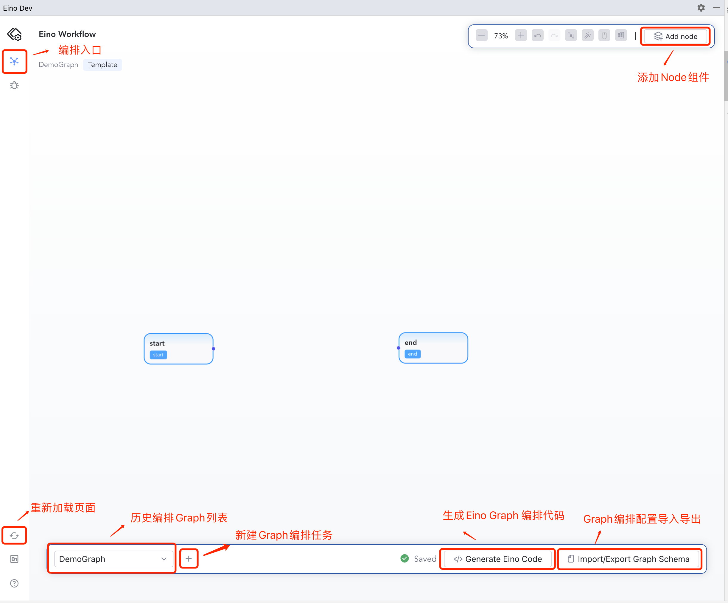点击进入 Eino Dev 插件,会展示如下界面,可点击图中圈选框进入编排。