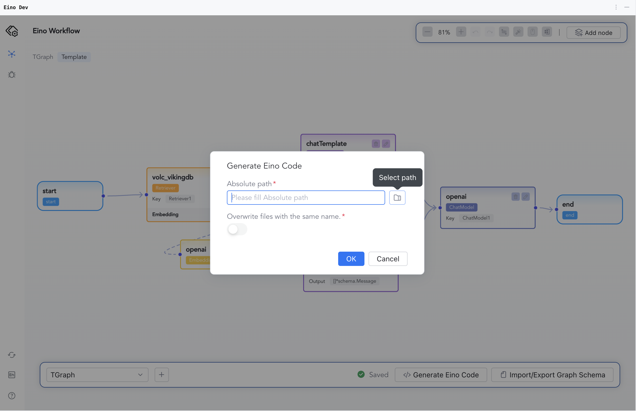 • 点击 “Generate as code” 并选择合适文件夹,将编排的 Graph 生成代码并保存到指定路径。