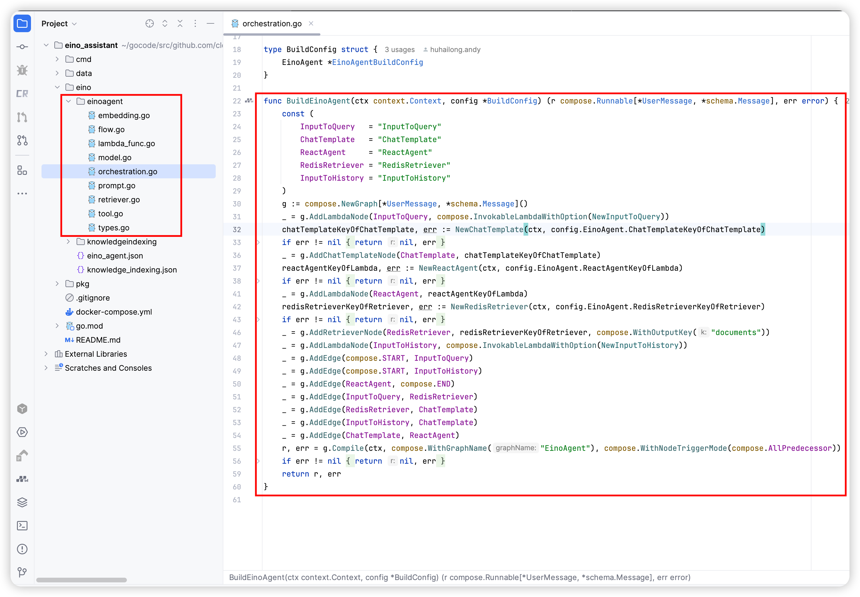 在「Eino 智能体」的场景下,BuildEinoAgent 构建的 Graph 实例可做到:根据用户请求和对话历史,从 Eino 知识库中召回上下文, 然后结合可调用的工具列表,将 ChatModel 循环决策下一步是调用工具或输出最终结果。
