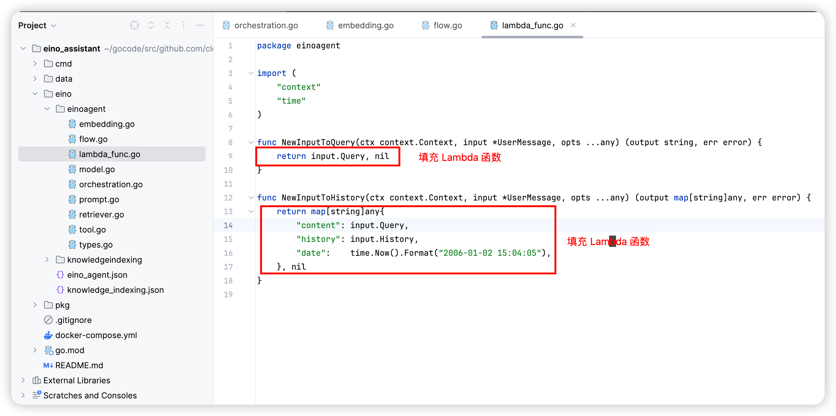 • lambda: 将开发者任意的函数 func(ctx context.Context, input I) (output O, err error),转换成可被编排的节点,在 EinoAgent 中,有两个转换场景