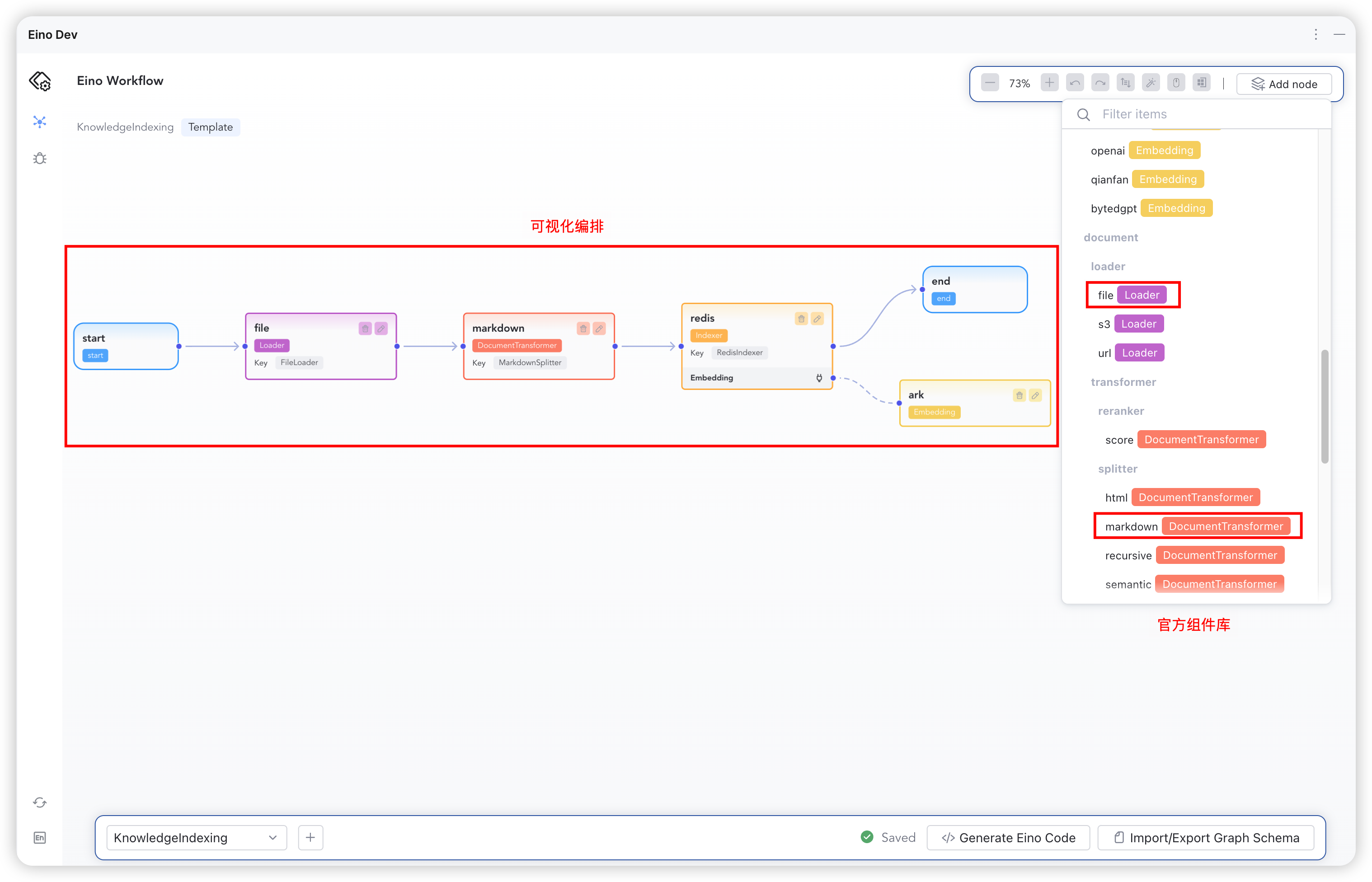 • 本示例可直接复制 eino/knowledge_indexing.json 中的 Graph Schema,来快速构建示例中的图