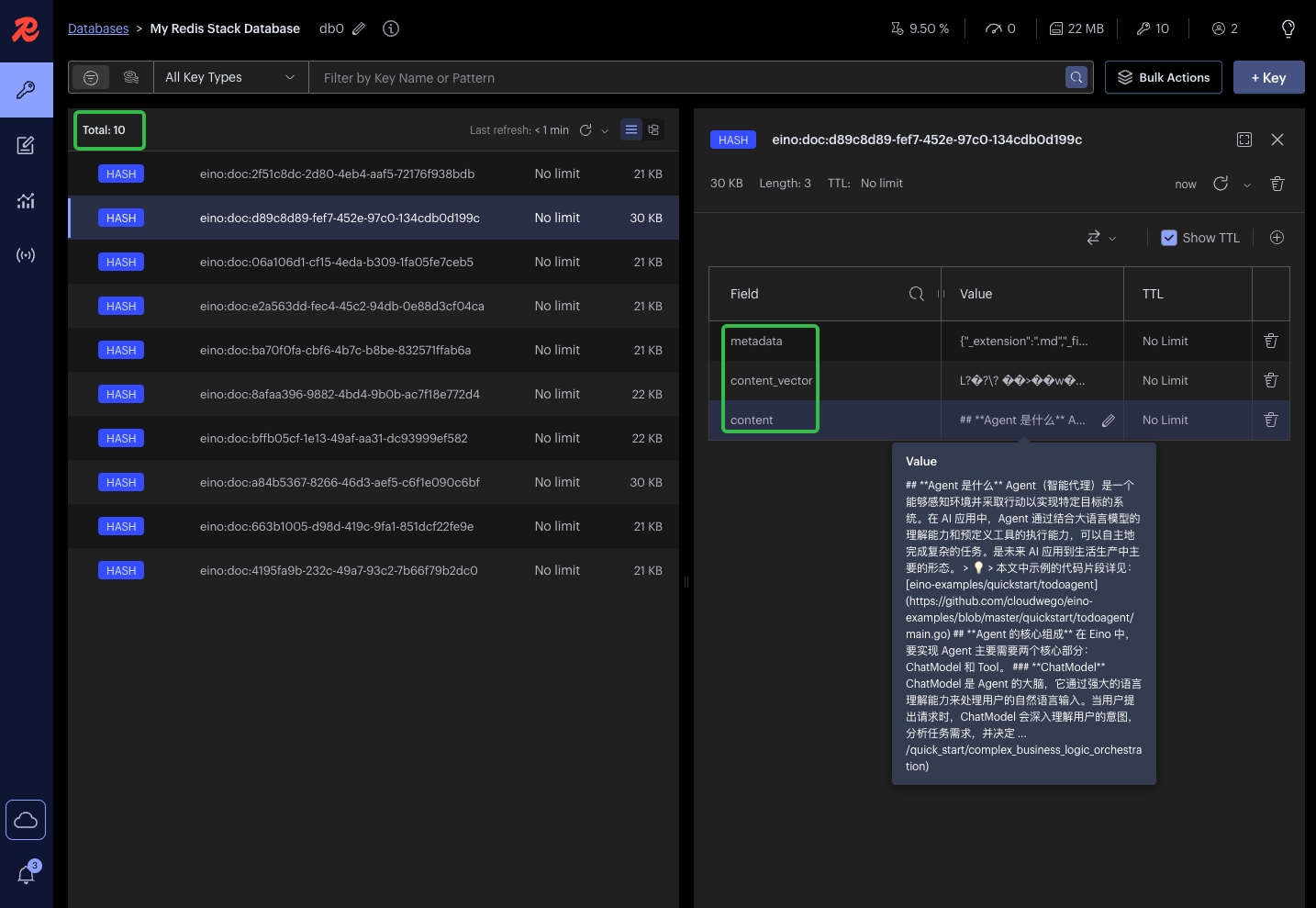 2. 执行运行成功后,即完成 Eino 知识库的构建,可在 Redis Web UI 中看到向量化之后的内容