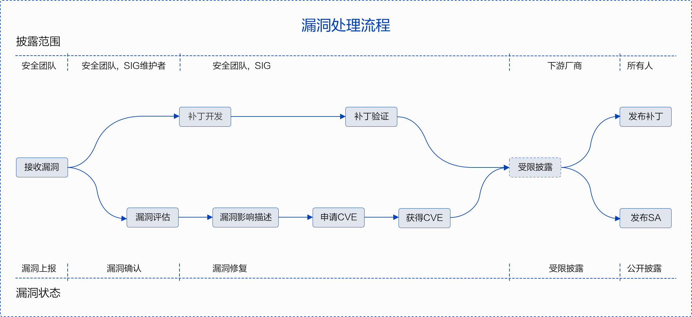 每个一个安全漏洞都会有一个指定的人员进行跟踪和处理,协调员是 CloudWeGo 安全委员会的成员,他将负责跟踪和推动漏洞的修复和披露。漏洞端到端的处理流程如下图。